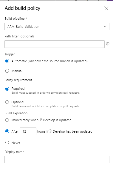 Select “Build Validation” and select the pipeline that was created by previous steps.