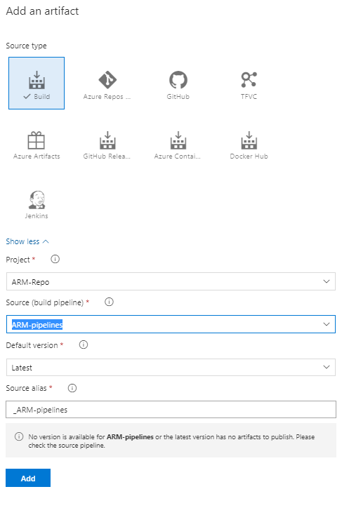 Add a artifact to the release pipeline, this is the artifact that is created by the build pipeline.